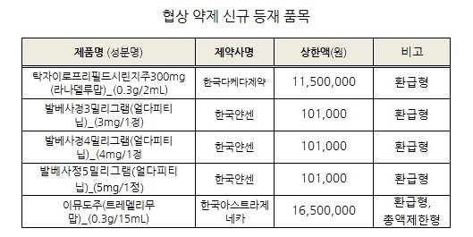 위험분담계약제(RSA) 트랙을 밟은 고가 신약 5품목이 내달부터 보험적용을 받는다. 또한 급여가 확대된 신약은 가격을 확 낮춘다.