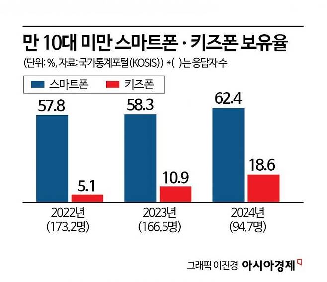 20일 국가데이터처 국가통계포털(KOSIS)에 따르면 만 10대 미만 연령층의 키즈폰 보유 비율은 2022년 5.1%, 2023년 10.9%, 2024년 18.6%로 매년 빠르게 상승 중이다. 같은 기간 스마트폰을 가지고 있다고 응답한 비율도 57.8%→58.3%→62.4%로 높아졌다. 저출산으로 10대 미만 연령층 수가 감소하고 있다는 점을 감안하면 어린이들의 휴대폰 사용이 빠르게 늘고 있다는 방증이다.