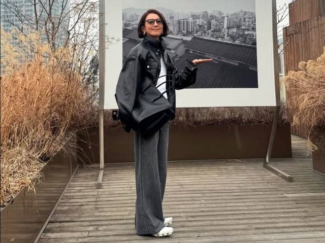 사진 속 김희애는 과한 연출 없이 편하게 서 있는 모습이다. 어깨선이 자연스러운 가죽 재킷과 힘 있게 떨어지는 팬츠 실루엣이 전체 비율을 길어 보이게 만든다. 슬림하지만 마른 느낌이 아닌, 균형 잡힌 체형이라는 점이 인상적이다. 특히 힙한 MZ룩으로 더 어려보이는 스타일을 완성했다.