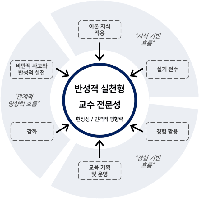 전문성의 형성과정은 출발점–무대–다리–길–도착점의 다섯 국면으로 정리됐다. 문제의식이 제도와 조직 문화 속에서 멘토링과 네트워크, 반복적 실천과 성찰을 거쳐 교육자로서의 정체성으로 통합되는 흐름이다. 특히 연구는 반성적 실천이 경험을 '연륜'이 아닌 '학습'으로 전환하는 핵심 계기임을 보여준다.