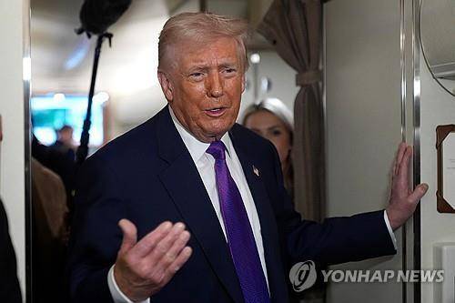 [19일 에어포스원에서 취재진과 만난 트럼프 미 대통령 (AP=연합뉴스 자료사진)]