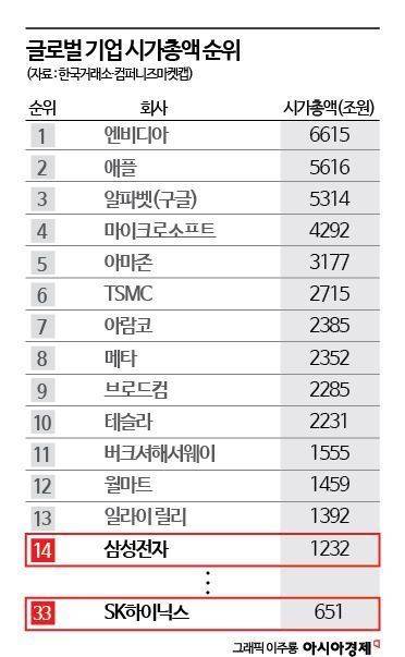 미국의 빅테크(대형 정보기술 기업)인 메타(8위)와 브로드컴(9위), 테슬라(10위) 등이 삼성전자의 시총을 앞서고 있으며 13위는 비만약으로 유명한 일라이 릴리가 차지했다. 100대 기업 안에서는 시총 651조원인 SK하이닉스가 33위로 국내 기업 중에서 삼성전자를 제외하고 유일하게 이름을 올렸다. 순수 반도체 기업 중에서는 엔비디아, TSMC, 브로드컴에 이어 삼성전자가 4위이며, SK하이닉스는 7위다.