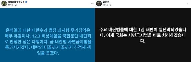| ▲ 19일 정청래 더불어민주당 대표는 자신의 페이스북에 "곧 내란범 사면금지법을 통과시키겠다. 내란의 티끌까지 끝까지 추적해 책임을 묻겠다"고 밝혔다. 김용민 의원도 "이제 국회는 사면금지법을 바로 처리하겠다"고 사면금지법 추진을 강조했다. |