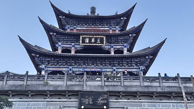 이제 오화루 남쪽으로 길을 따라 간다. 그곳에 따리 고성에서 가장 크고 웅장한 남문이 있다. 승은문으로 불리는 남문에는 1층 기단부 위에 문헌루(文獻樓)라 불리는 2층 누각이 세워져 있다. 기단부 위에는 1961년 궈모루(郭沫若)이 쓴 따리(大理)라는 석각이 새겨져 있고, 2층 누각에는 문헌명방(文獻名邦)이라는 편액이 걸려 있다. 문학에 밝은 인재들이 많이 배출되고, 문헌이 풍부하게 소장된 훌륭한 지방이라는 뜻이다. 이 글씨는 청나라 강희제 때 운남제독을 지낸 편도(偏圖)가 썼다고 한다.