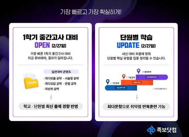 족보닷컴은 3월 개학과 동시에 시작되는 수업 진도와 수행평가로 인해 시험 준비 골든타임을 놓치기 쉽다는 점을 고려해, 콘텐츠 오픈 시점을 2월 27일로 앞당겼다. 이를 통해 학생들이 학기 시작과 동시에 ‘중간고사 대비 모드’로 전환할 수 있도록 했다.