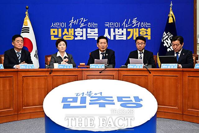[더팩트ㅣ국회=배정한 기자] 정청래 더불어민주당 대표(가운데)가 20일 오전 서울 여의도 국회에서 열린 최고위원회의에 참석해 모두발언을 하고 있다.