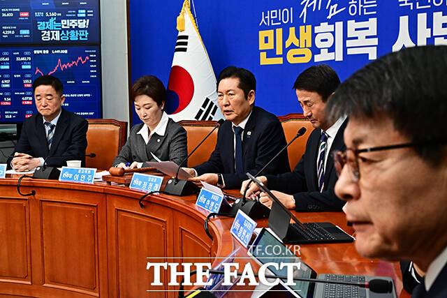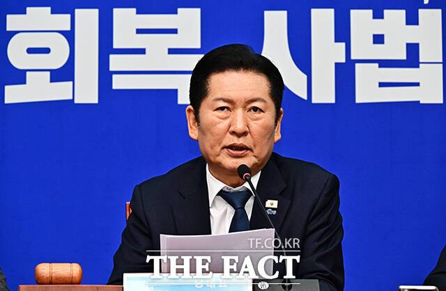 정청래 더불어민주당 대표(가운데)가 20일 오전 서울 여의도 국회에서 열린 최고위원회의에 참석해 모두발언을 하고 있다.