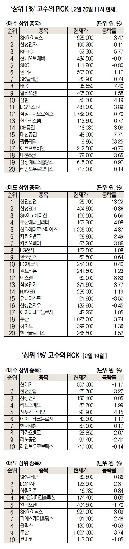 미래에셋증권(006800)에서 거래하는 고수익 투자자들이 20일 오전 SK하이닉스(000660), 삼성전자(005930), RFHIC(218410) 등을 가장 많이 순매수한 것으로 집계됐다.