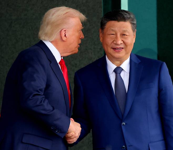 [도널드 트럼프 미국 대통령과 시진핑 중국 국가주석이 30일 부산 김해공군기지 의전실 나래마루에서 미중 정상회담을 마친 뒤 회담장을 나서며 대화하고 있다. (사진=연합뉴스)]