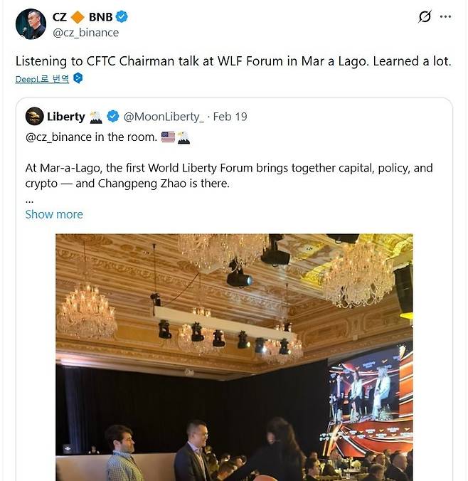 바이낸스 창업자 자오창펑은 전날 소셜미디어(SNS) 엑스에서 트럼프 일가의 가상화폐 업체인 '월드 리버티 파이낸셜'(이하 월드 리버티)이 플로리다주 팜비치의 마러라고 리조트에서 주최한 연회에 참석한 사진을 리트윗했습니다.