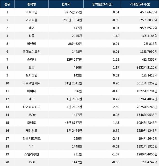 한편, 솔라나는 12만 247원으로 24시간 등락률은 1.59% 상승했다. 시가총액은 68조 3439억 원이다. 같은 시각 트론은 410원으로 24시간 동안 1.17% 상승하며 거래량은 9132억 2125만 원을 기록하고 있다.