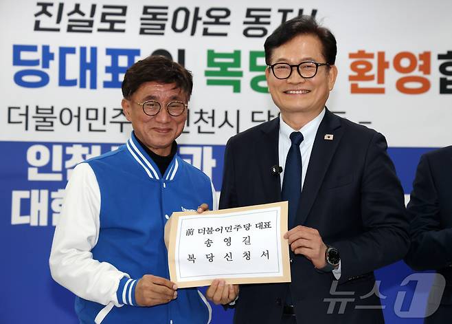 (인천=뉴스1) 이광호 기자 = 송영길 전 더불어민주당 대표가 20일 오후 인천 남동구 더불어민주당 인천시당을 찾아 고남석 인천시당 위원장에게 복당 신청서를 제출하고 있다. 2026.2.20/뉴스1