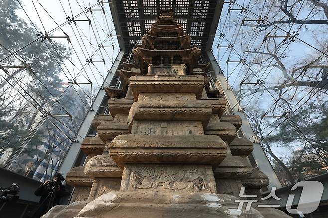 (서울=뉴스1) 안은나 기자 = 20일 오후 서울 종로구 탑골공원에서 1999년 유리보호각 설치 이후 27년 만에 처음으로 원각사지 십층석탑 내부가 공개되고 있다.