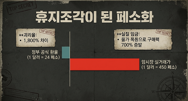 결정적 전환점은 팬데믹이었다. 관광 산업이 붕괴하며 GDP가 급락했다. 2021년 화폐 개혁이 단행됐지만 공식 환율과 암시장 환율의 격차는 폭발적으로 벌어졌다. 1달러당 24페소로 고정했던 공식 환율은 시장에서 450페소 수준으로 무너졌다. 실질 임금은 급감했고 국영상점에는 물자가 사라졌다.