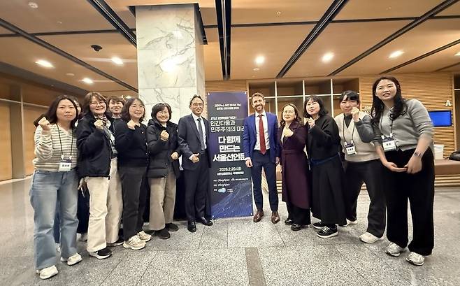 | ▲ 2026 오마이뉴스 글로벌포럼에 참석한 광주 광산구 직원들이 오연호 대표, 트리스탄 해리스 인간중심기술센터 대표와 기념촬영하고 있다. |