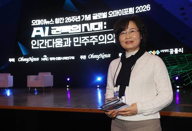 전경희 광주광역시 광산구청 문화교육국장은 20일 오후 서울 중구 세종로 대한상공회의소 국제회의장에서 열린 <오마이뉴스> 창간 26주년 오마이포럼 'AI 권력의 시대 : 인간다움과 민주주의의 미래'에서 "AI 초보자이지만, 많이 배우고 싶은 마음으로 참석했다"라며 이같이 소감을 밝혔다.
