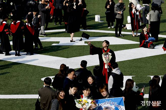 학사모를 쓴 졸업생들은 꽃다발과 학위증을 들고 정든 공간에서 졸업 동기·가족들과 기념사진을 남겼다. 하늘 향해 학사모를 던지며 졸업을 자축하기도 했다.