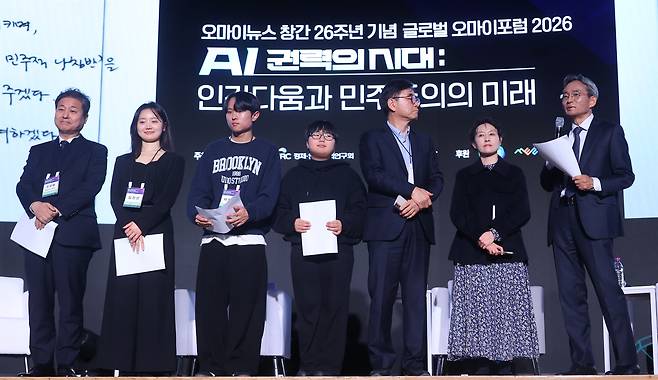 | ▲ 오연호 <오마이뉴스> 대표와 김영배 더불어민주당 의원, 임정연, 박천웅씨 등 참석자들이 20일 오후 서울 중구 대한상공회의소 국제회의장에서 열린 <오마이뉴스> 창간 26주년 기념 글로벌 오마이포럼 2026 'AI 권력의 시대 - 인간다움과 민주주의의 미래'에서 나의 서울 선언문을 발표하고 있다. |