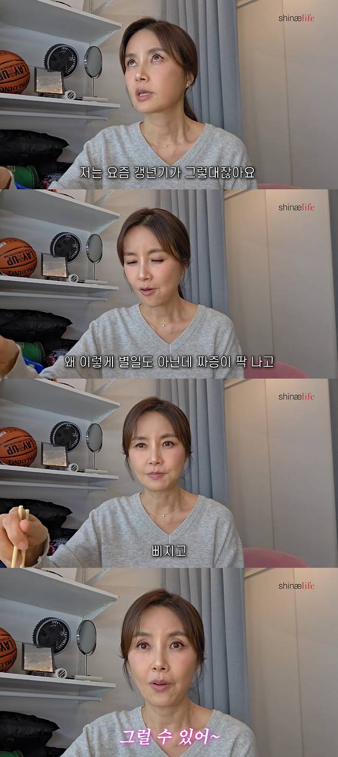 신애라는 "요즘 여러분들 기분이 어떠신가. 저는 기분이 계속 왔다 갔다 한다. 갱년기라서 화가 좀 많아진 것 같다. 별일도 아닌데 짜증이 나고 화가 나고 삐지게 된다. 그래서 자신을 다스려야겠다는 생각을 했다"라고 털어놨다.