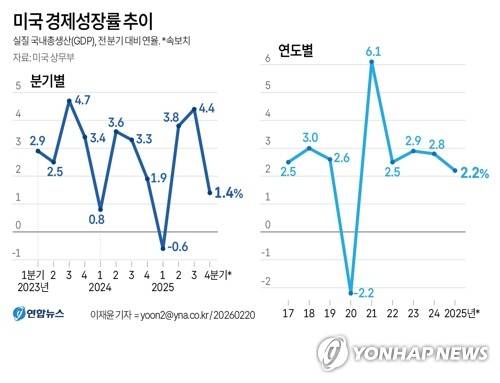 (서울=연합뉴스) 이재윤 기자 = 미 상무부는 작년 4분기 미국의 국내총생산(GDP) 증가율이 1.4%(전기 대비 연율)로 집계됐다고 20일(현지시간) 밝혔다. 이는 다우존스가 집계한 전문가 전망치(2.5%)를 큰 폭으로 밑돈 수치다.