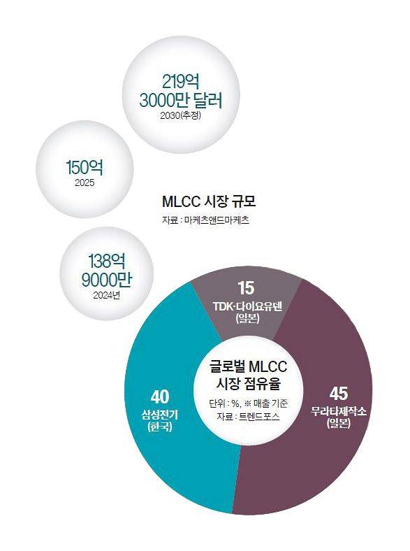 올해는 수요 증가에 가격 상승까지 이어져 성장세가 더욱 견고해질 것 같다. 글로벌 시장조사기관 마케츠앤드마케츠에 따르면 MLCC 시장은 지난해 150억 달러에서 2030년 219억3000만 달러로 연평균 7.9% 성장할 전망이다. 또 다른 시장조사기관인 트렌드포스는 “AI 적용 범위가 로봇, 자율주행차, 스마트 글라스 등으로 빠르게 확산하면서 MLCC 사용이 늘어나는 추세”라고 분석했다. 특히 AI 서버는 막대한 전력을 소비해 고온·고용량의 MLCC가 들어가는데, 고온·고용량 제품을 대량 양산할 수 있는 기업은 삼성전기와 일본의 무라타제작소뿐이다.