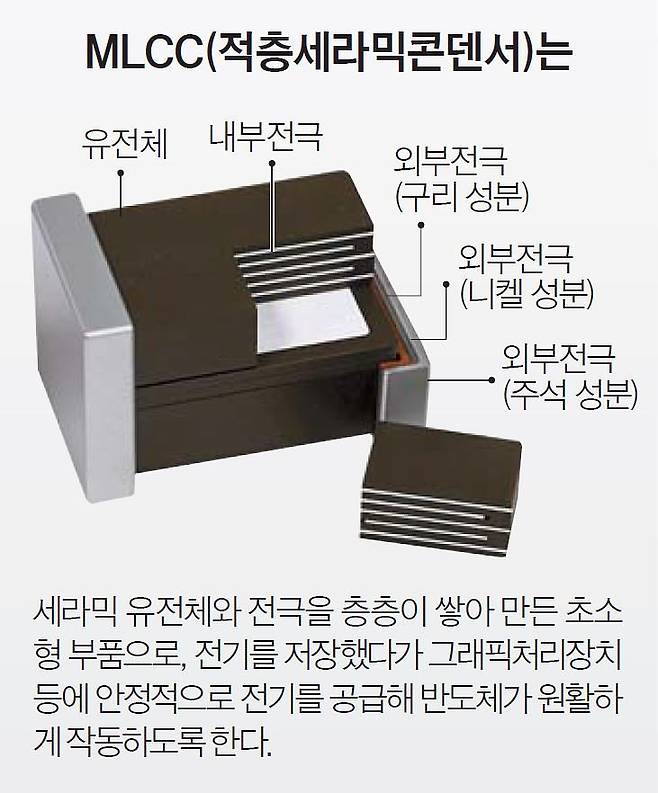 AI 덕을 보고 있는 대표적인 분야가 MLCC다. MLCC는 전자기기 회로에서 전기를 저장했다가 일정량을 안정적으로 내보내는 일종의 ‘댐’이다. 가로·세로 길이가 각각 0.3㎜ 이하의 초소형 부품으로, 전자기기에 없어서는 안 되는 부품이자 한 전자기기에 수백에서 수만 개가 들어가 ‘산업의 쌀’로도 불린다. 스마트폰에는 1000여 개, 전기차에는 1만 개, AI 서버에는 3만여 개가 필요하다. 특히 엔비디아의 블랙웰 등 최신 AI 서버는 한 대에만 기존의 10배인 30만여 개가 필요하다는 게 업계의 설명이다. 이 때문에 밤낮으로 공장을 돌려도 공급이 달린다.