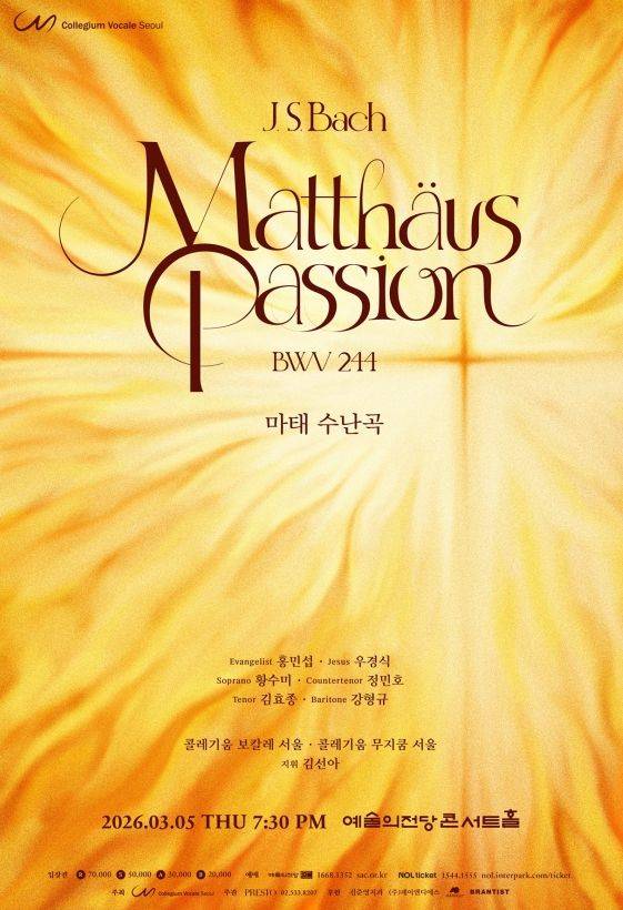 한국의 대표적 바로크 합창 단체인 콜레기움 보칼레 서울(지휘 김선아)이 3월 5일 예술의전당 콘서트홀에서 바흐의 마태 수난곡을 선보인다(포스터). 2007년 창단한 콜레기움 보칼레 서울은 지난 19년간 합창 음악의 근간이 되는 레퍼토리를 꾸준히 무대에 올리고 있다. 2023년 마태 수난곡 연주로 제2회 서울예술상 음악 부문 최우수상을 받은 바 있다. 올해 연주는 고음악 전문 연주 단체인 콜레기움 무지쿰 서울을 비롯해 복음사가 역의 테너 홍민섭, 예수 역의 베이스바리톤 우경식과 함께 소프라노 황수미, 바리톤 강형규, 카운터테너 정민호 그리고 테너 김효종이 함께한다.