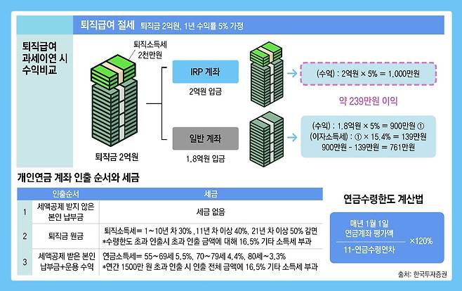 과세이연 효과는 생각보다 크다. 예를 들어 퇴직금 2억 원을 IRP 등 연금계좌로 넣을 때와 일시불로 탔을 때를 비교해 보자. 퇴직소득세는 근속연수와 퇴직금 액수에 따라 다르지만 10%로 가정한다. 연금계좌에선 퇴직소득세를 당장 떼지 않기 때문에 원금 2억 원을 고스란히 운용할 수 있다. 연 5%라면 수익금이 1000만 원이다. 반면 일반계좌라면 세금 떼고 1억8000만 원이 남는다. 5% 수익을 내도 900만 원이고, 여기에 이자소득세 15.4%까지 떼면 761만 원이 남는다. 연간 240만 원 가까이 차이 난다. 퇴직금도 원래 내야 하는 퇴직소득세의 30∼50%를 감면해서 내고, 세금을 내지 않은 금액만큼의 복리 효과가 더 커진다.