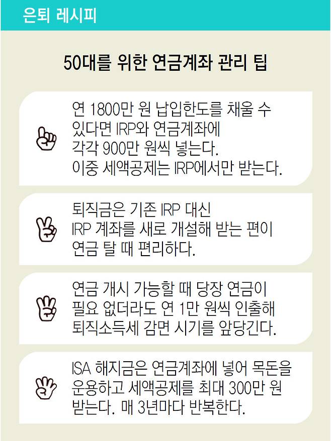다만 세액공제 받은 금액은 꼬리표가 붙는다. 나중에 인출할 때 세액공제 받은 금액이나 운용수익금 수령액이 연 1500만 원을 넘으면 16.5%의 기타소득세를 내야 한다. 그래서 세액공제 받은 돈과 안 받은 돈을 계좌별로 분리하는 것을 추천한다. 연금이 더 중요한 50대라면 세액공제 받지 않은 900만 원을 연금저축에, 세액공제 받은 900만 원을 IRP에 넣으면 연금 인출 시 편리하다.