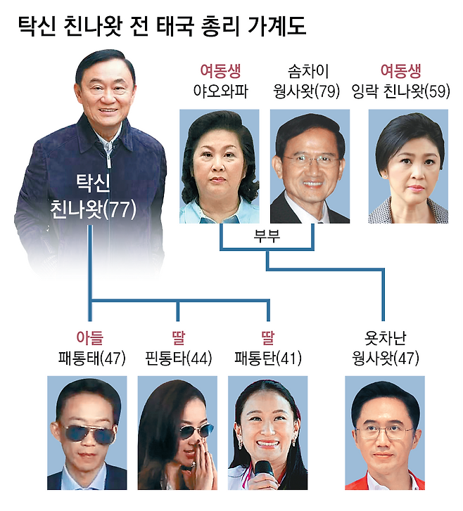 화교계 통신 재벌인 탁신은 2001년 2월 총리에 오른 후 막강한 영향력을 행사해 왔다. 2006년 9월 그가 쿠데타로 실각했음에도 2008년 그의 매제 솜차이 웡사왓(79), 2011년 여동생 잉락 친나왓(59), 2024년 8월 딸 패통탄 친나왓(41)이 총리에 오르는 등 탁신 가문에서만 4명의 총리가 나왔다. 탁신은 가족의 집권 당시 막후에서 사실상 대리 통치를 했다는 평을 얻고 있다.