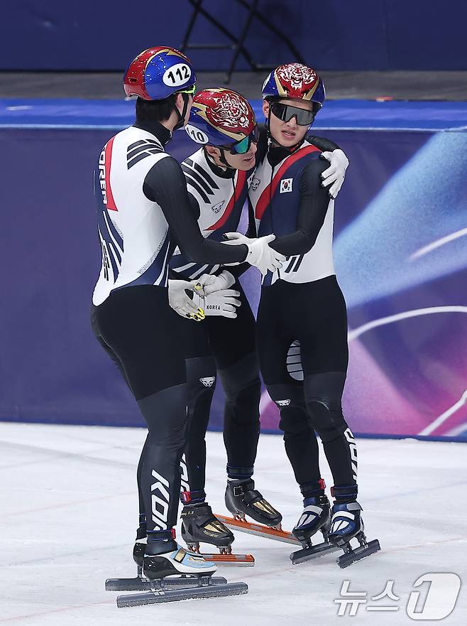 (밀라노=뉴스1) 김성진 기자 = 쇼트트랙 이준서, 황대헌, 이정민이 20일(현지시간) 이탈리아 밀라노 아이스 스케이팅 아레나에서 열린 2026 밀라노·코르티나담페초 동계올림픽 쇼트트랙 남자 5000m 계주 결승에서 은메달을 확보한 후 포옹하고 있다. 2026.2.21/뉴스1
