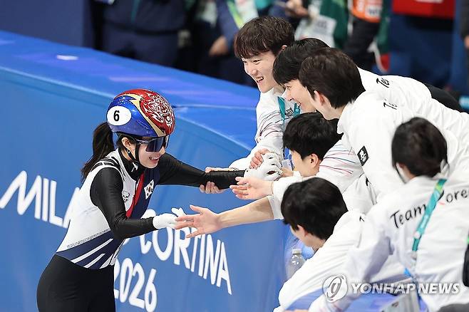 (밀라노=연합뉴스) 서대연 기자 = 20일(현지시간) 이탈리아 밀라노 아이스스케이팅 아레나에서 열린 2026 밀라노ㆍ코르티나담페초 동계올림픽 쇼트트랙 여자 1,500m 결승에서 금메달을 차지한 김길리가 대표팀 동료들의 축하를 받고 있다. 2026.2.21