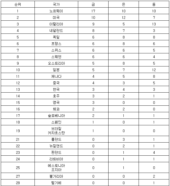 2026 밀라노·코르티나담페초 동계 올림픽 국가별 메달 순위(현지시간 20일)