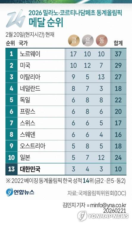 [그래픽] 2026 밀라노·코르티나담페초 동계올림픽 메달 순위(19일)