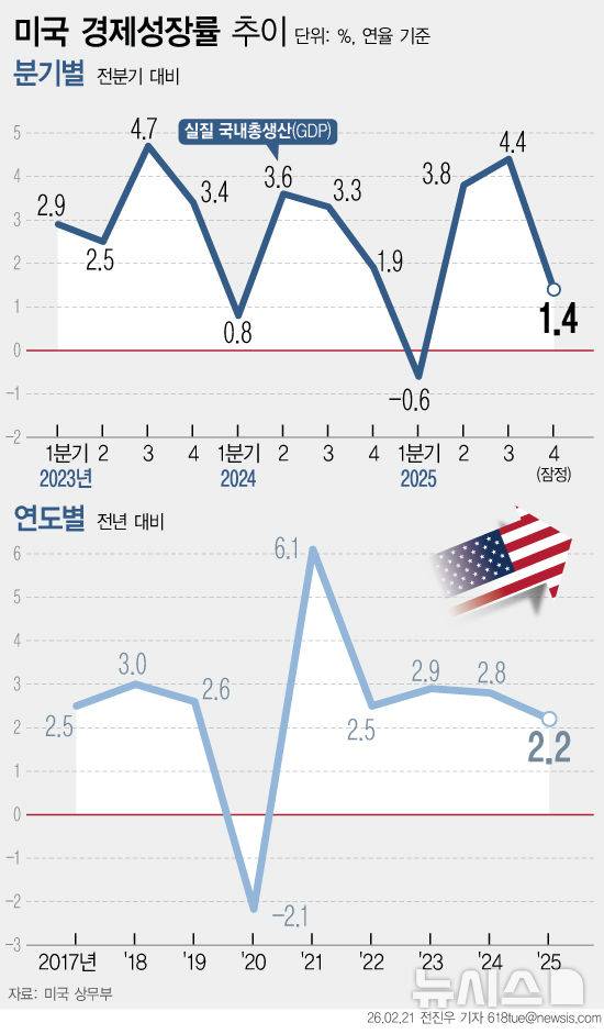 [서울=뉴시스] 20일(현지시간) 미국 상무부에 따르면 미국의 지난해 4분기 실질 국내총생산(GDP)은 연율 1.4% 성장한 것으로 집계됐다. 연간 기준으로는 2025년 전체 성장률이 2.2%를 기록했다. (그래픽=전진우 기자)