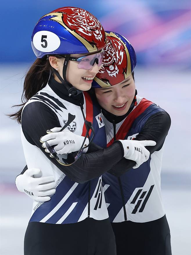 | ▲ 20일(현지시간) 이탈리아 밀라노 아이스스케이팅 아레나에서 열린 2026 밀라노ㆍ코르티나담페초 동계올림픽 쇼트트랙 여자 1,500m 결승에서 은메달을 획득한 최민정이 금메달을 획득한 김길리를 축하해주고 있다. |