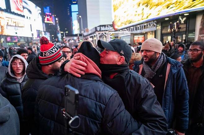 [뉴욕=AP/뉴시스] 20일(현지 시간) 미국 뉴욕의 타임스퀘어에서 무슬림 공동체 구성원들이 라마단 기간 저녁 기도 '타라위'를 앞두고 포옹하며 인사를 나누고 있다. 2026.02.21.