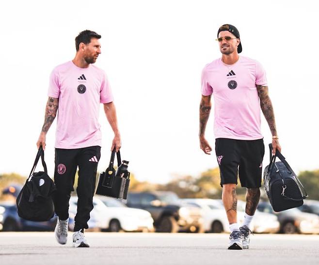 사진에는 분홍색 훈련복 차림의 메시가 로드리고 데 폴과 함께 미국 LA에 도착한 모습이 담겼다.