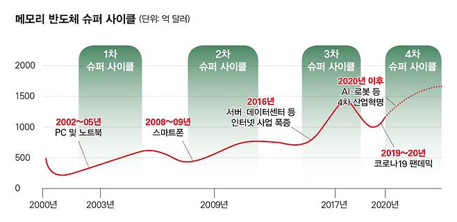 반도체 산업은 그동안 4~5년을 주기로 호황과 불황을 반복해 왔다. 이른바 '실리콘 사이클'이다. 반도체 공급 부족으로 가격이 상승하면 반도체 제조사들은 설비 투자 확대에 나서고, 그 결과 공급이 과잉으로 돌아서면 가격이 다시 하락하는 패턴을 보였다. '슈퍼 사이클'은 이런 흐름 속에서 특정 수요처의 폭발적 성장에 힘입어 2년 이상의 장기 호황이 이어지는 시기를 말한다.