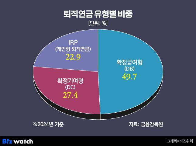 이런 제도 차이가 적립금 비중 변화로 나타나고 있습니다. DB형에서 DC형으로 자금이 이동하는 '퇴직연금 머니무브'가 뚜렷해지고 있는 건데요. DB형 비중은 2019년 62.6%에서 2024년 49.7%로 5년 새 12.9%포인트 하락했는데요. 반면 DC형은 25.4%에서 27.4%로 소폭 상승했고, 개인형 퇴직연금(IRP)은 11.6%에서 22.9%로 빠르게 증가하고 있습니다.
