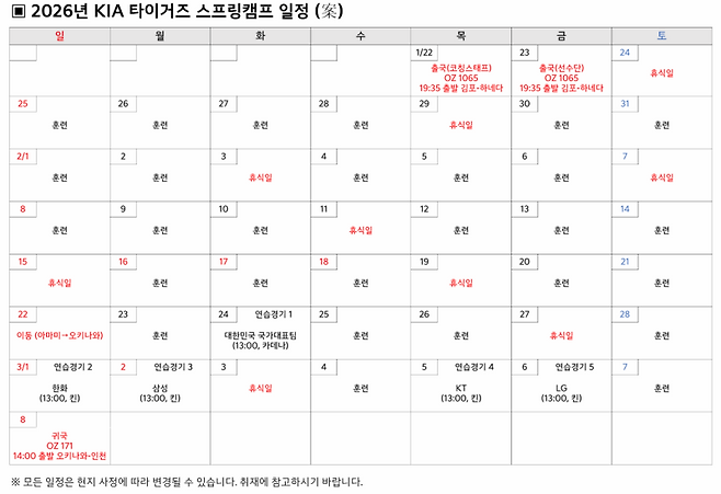 KIA는 "21일을 끝으로 1차 스프링캠프를 마치고, 2차 캠프를 위해 22일 오키나와로 이동한다"고 밝혔다.