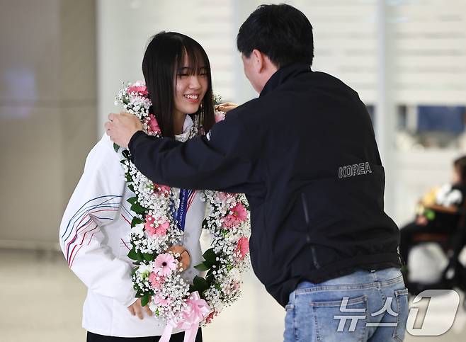 (인천공항=뉴스1) 김도우 기자 = 2026 밀라노·코르티나담페초 동계올림픽 스노보드 빅에어에서 동메달을 차지한 유승은이 21일 인천공항2터미널을 통해 귀국해 꽃목걸이를 받고 있다. 2026.2.21/뉴스1