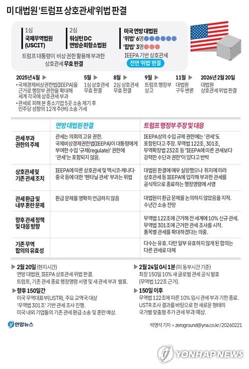 (서울=연합뉴스) 박영석 기자 = 도널드 트럼프 미국 대통령이 한국을 비롯한 세계 각국에 부과한 이른바 '상호관세'가 위법이라고 미 연방 대법원이 20일(현지시간) 판결했다.