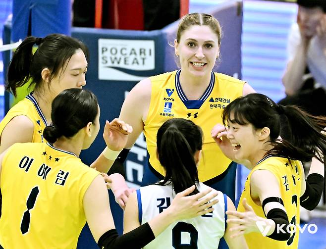 현대건설은 21일 수원체육관에서 열린 진에어 2025~26 V리그 홈경기에서 IBK기업은행을 세트 스코어 3-1(25-19, 32-30, 25-27, 25-16)로 물리쳤다.