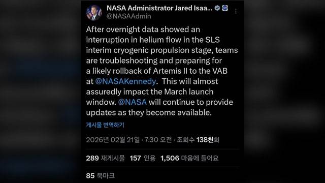 재러드 아이작먼 미국 항공우주국(NASA) 국장은 현지 시각 어제(21일) 엑스(X·옛 트위터)를 통해 "간밤에 집계된 데이터에 따르면 우주발사시스템의 중간 극저온 추진 로켓에서 헬륨 흐름에 막힘이 있다는 것이 확인됐다"며 "팀이 문제를 해결 중이며 우주선을 조립동(VAB)으로 다시 가져가게 될 가능성에 대비 중"이라고 밝혔습니다.