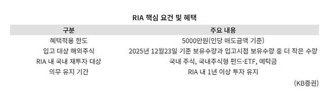 다만 해외주식 매도 대금이 RIA 내에 묶이게 되는 만큼 투자자들의 신중한 선택이 필요하다는 지적이다. 강수인 KB증권 세무전문위원은 "RIA는 해외주식 양도소득에 대한 세제 혜택을 제공하는 만큼 투자자 선택을 제한하는 양면성을 지닌다"며 "1년간 자금 인출이 불가능하므로 단기적인 현금 흐름이 필요한 소액투자자에게는 부담으로 작용할 수 있다"고 말했다.