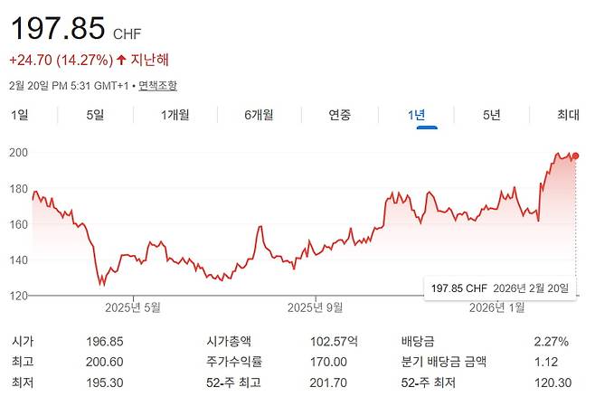 스위스 증권거래소에 상장된 스와치그룹의 주가는 지난 20일 197.85스위스프랑에 마감했습니다. 최근 1년간 14.27% 오르며 바닥을 찍은 모습입니다.