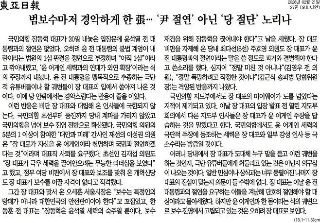 장동혁 대표의 회견에 보수 언론도 어지간히 놀란 것 같습니다. 21일 치 발행 신문 사설 제목은 이렇습니다.