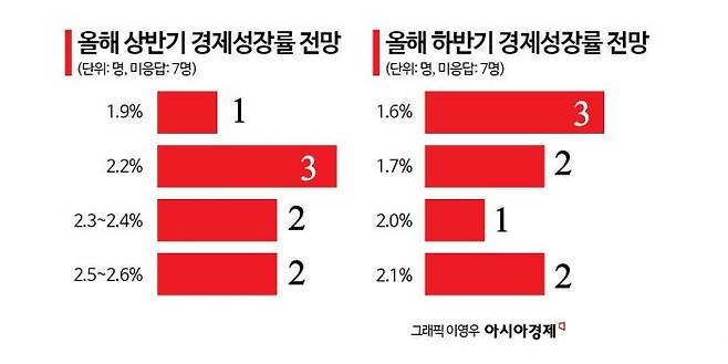 올해 성장률은 '상고하저(上高下低)'의 흐름을 예상했다. 구체적으로 상반기에는 2.2%(응답자 8명 중 3명), 하반기에는 1.6%(3명)를 예상한 이들이 가장 많았다. 이는 지난해 상반기 저성장에 따른 기저효과와 정부 지출이 집중적으로 집행되는 점이 맞물린 결과다.