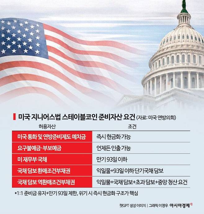 미국의 경우 준비자산의 안전성과 유동성을 법률 차원에서 명확히 담보하고 있다. 미국의 스테이블코인 규제 법안인 '지니어스 법'은 발행사가 준비자산을 1대1로 보유하도록 하되 그 자산을 미국 통화, 부보예금, 특정 단기 미 국채 및 국채 담보 환매조건부채권(레포) 등 고유동성 자산으로 제한하고 있다. 이는 단순한 100% 적립 의무를 넘어, 위기 시 즉시 현금화가 가능한 자산 구조를 제도적으로 설계한 것이다.